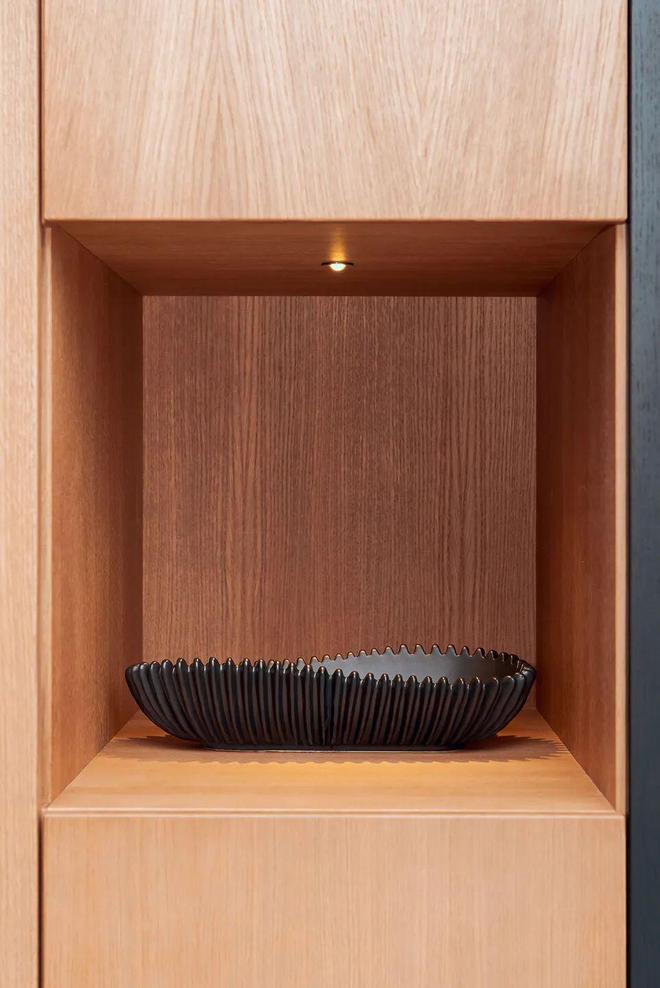 在一楼,主入口位于宽敞的起居空间之前,在那里我们找到了一张大而舒适的沙发(Calía)用于电视区,四张扶手椅(Connubia)用于交谈区。该空间由两个基于manuarino工作室独家且未发表的设计的木工元素所主导:入口处的展位,也生成了配备齐全的电视墙,以及带有悬臂台阶的楼梯,它成为较低的酒吧部分和高部分的瓶架。楼梯的尽头是隐藏着客用浴室的大型木质空间,浴室被一扇与浴室墙板连续的全高齐平门很好地隐藏起来。