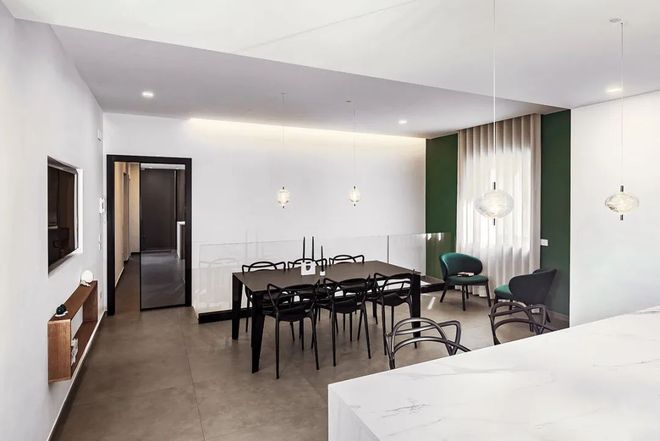 浴室的特点是一块大板的黑色 Marquina 大理石效果粗陶器,给浴室带来了非常优雅的氛围,并放大了空间,尽管在尺寸上也很重要,但由于石材表面的分布,空间被认为非常大超过整个高度。上至一楼,起居区设有用餐区和厨房岛。厨房(Veneta cucine)的墙壁主要配有柱子,中央部分设有工作台,以及一个三米长的大岛,或者更准确地说,半岛(因为它靠墙设置),配有大型瓷器top (Decton) 保证了非常慷慨的工作计划。睡眠区由反射烟色玻璃推拉门隔开,将卧室走廊与用餐区隔开。走廊里有一件大外套和一个口袋空的区域。非常重要的双人卧室有一个由定制木工制成的床头板,漆成开孔灰色,与上面墙壁的颜色连续,而发光凹槽又被发光凹槽照亮,产生非常宜人的场景洗墙效果。
